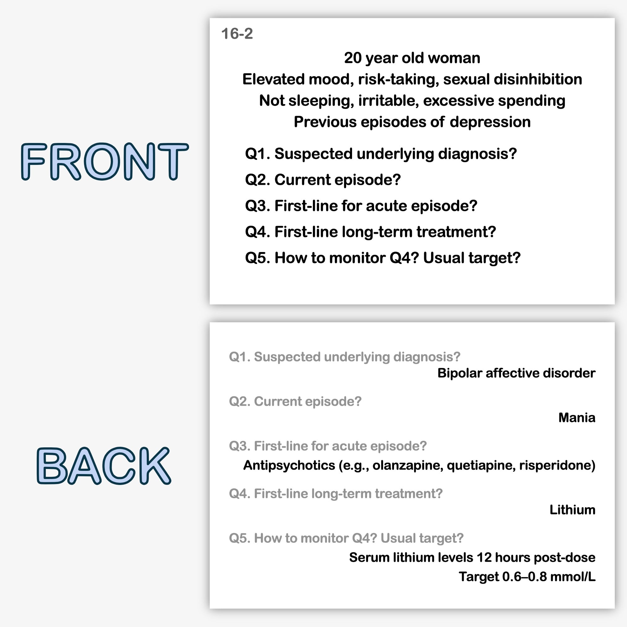 The Finals Revision Flashcards cover the key content for medical school finals. They cover a broad range of specialties for finals, including paediatrics, obstetrics and gynaecology, dermatology, and psychiatry. They are smaller (A7), do not contain illustrations and are printed in black and white.